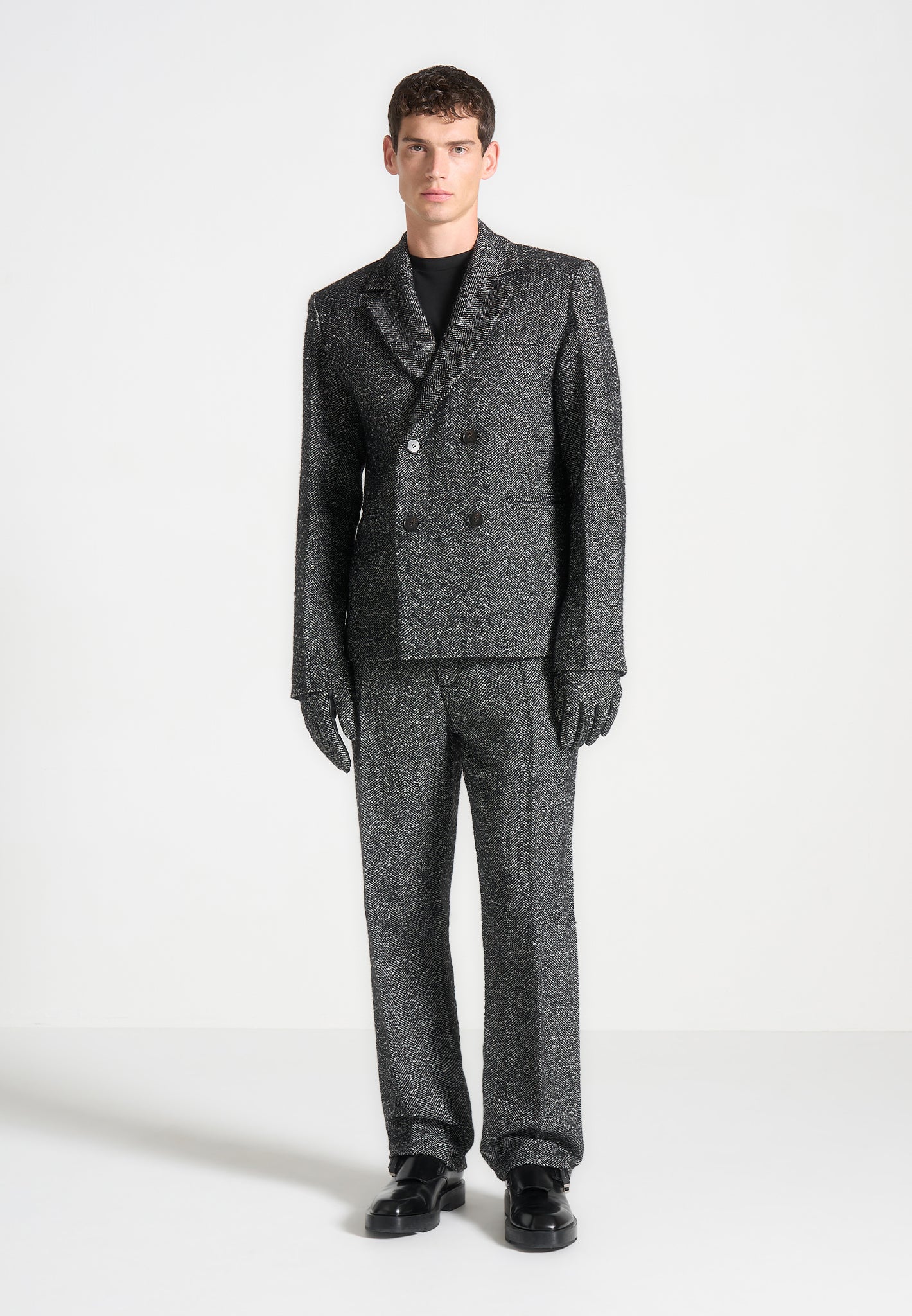 Leather and Herringbone Gloves - Black